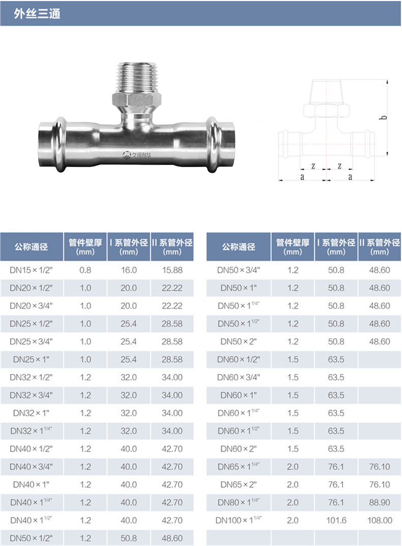 | 产品分类products | 外丝三通丨材质(Grade): 304/304L、316L 丨原料来源(Source of raw materials): 全部符合相关国家标准要求,用料来源酒钢、太钢、张浦、东特等 丨焊接方式(Welding method): 氩弧焊或等离子焊(TIG OR PLASMA在线)+氩弧焊(TIG离线) 丨执行标准(Executive standard): GB/T 19228.2-2011 GB/T12771 丨参数对照表(Parameters):