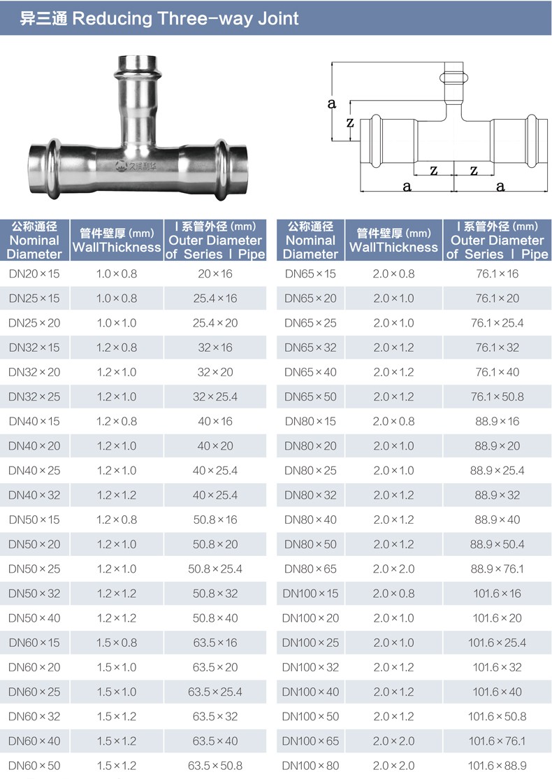 | 产品分类products | 异接三通丨材质(Grade): 304/304L、316L 丨原料来源(Source of raw materials): 全部符合相关国家标准要求,用料来源酒钢、太钢、张浦、东特等 丨焊接方式(Welding method): 氩弧焊或等离子焊(TIG OR PLASMA在线)+氩弧焊(TIG离线) 丨执行标准(Executive standard): GB/T 19228.2-2011 GB/T12771 丨参数对照表(Parameters):