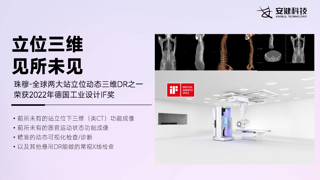 作为全球领先的三维悬吊动态数字化X线摄影系统,珠穆在2022年德国汉诺威工业设计论坛中荣获设计大奖(IF奖),凭借着简洁实用的结构与功能设计,珠穆可以实现多种模态下的X线摄影检查,包括一站式的二维检查与三维检查;器官运动功能成像检查;动态可视化检查;全脊柱/全下肢检查等,是全球悬吊式X线摄影系统中的创新佼佼者。